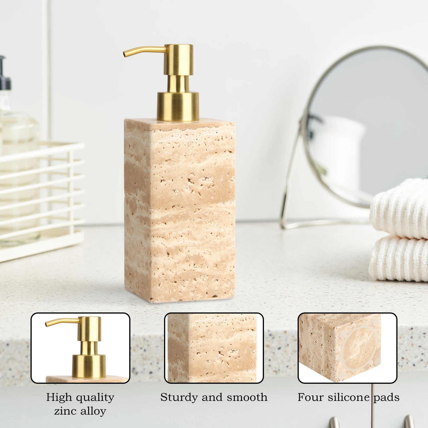 Suitable for holding and dispensing liquid soap, hand lotion, shampoo, and other personal care liquids in dry and humid indoor environments, ideal for daily household use and commercial settings.