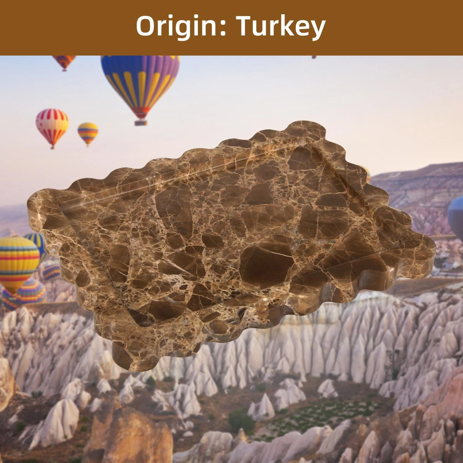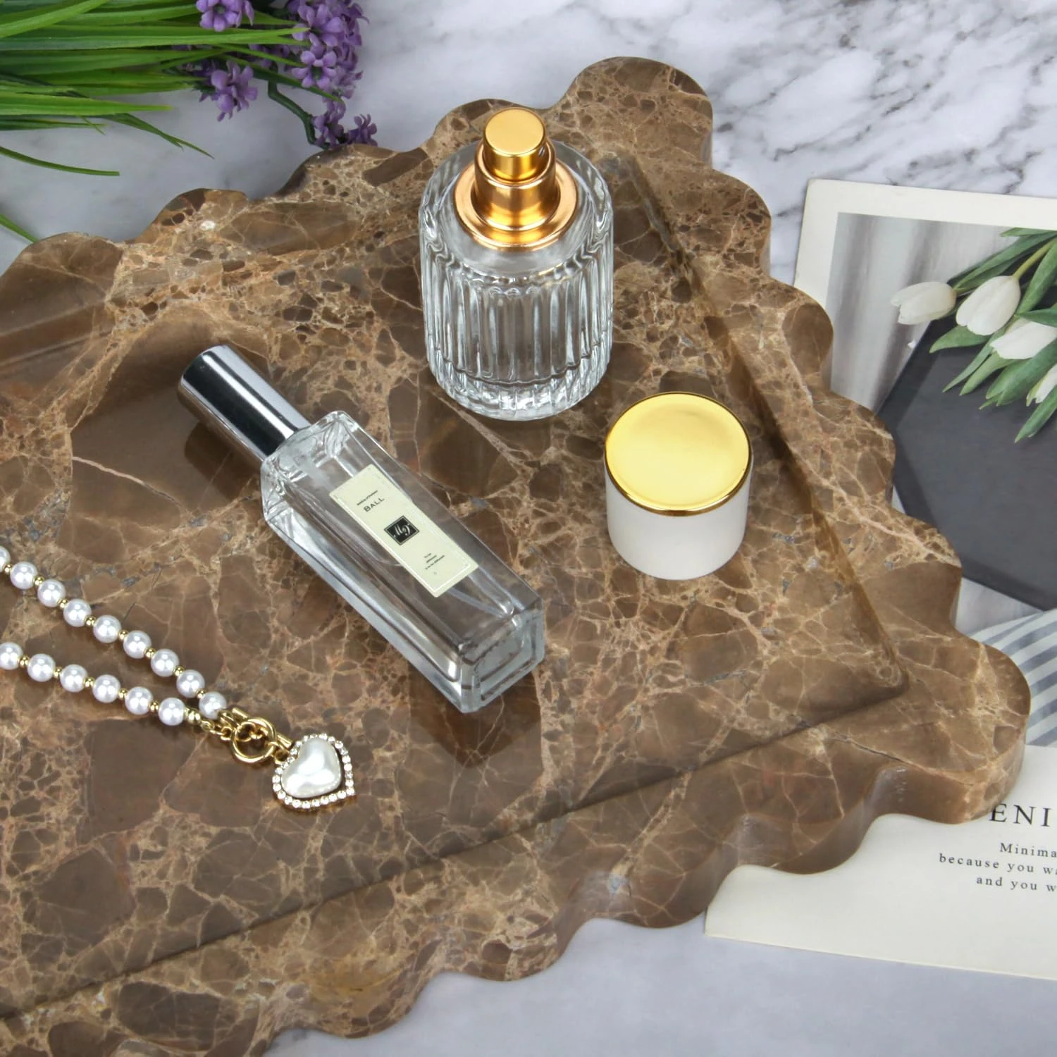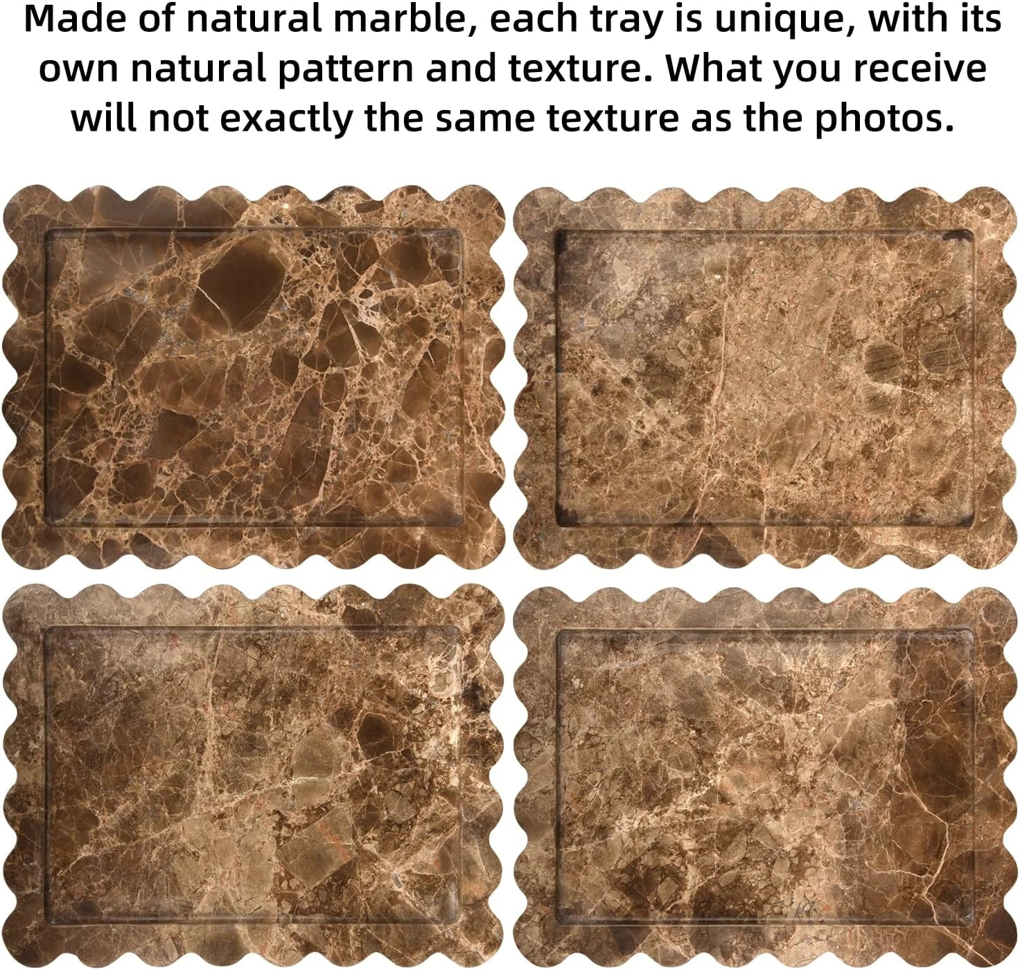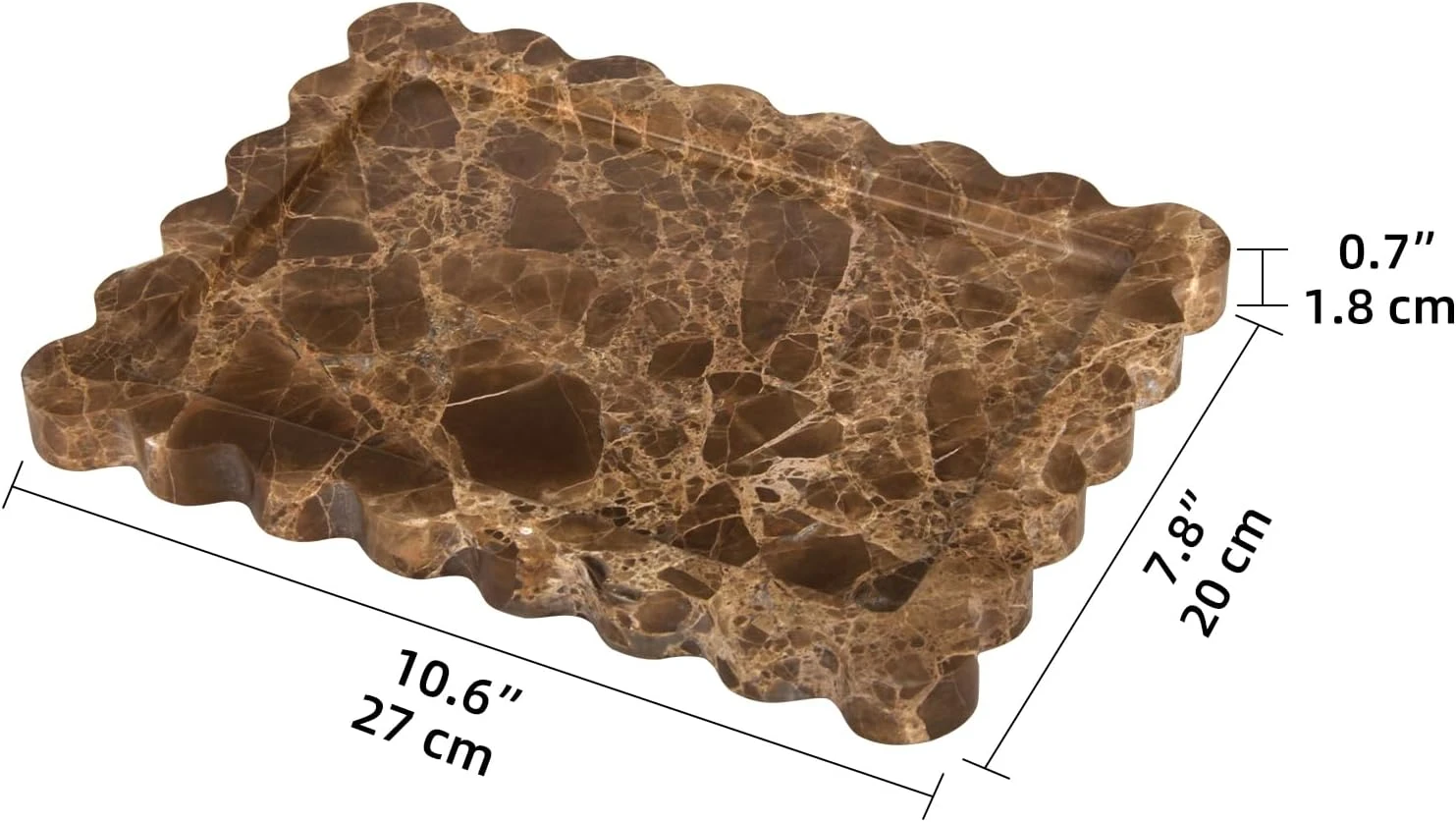 Displays and stores perfume, jewelry, cosmetics, skincare, keys, watches, candles and small daily essentials, keeping vanities, dressers, countertops and entryways organized while elevating interior aesthetics.Crafted from premium solid Coffee Net (Emperador Dark) marble with a rich dark brown base and distinctive golden webbed veining, ensuring exceptional stability and long-lasting durability for daily use.The spacious rectangle tray design with a distinctive wave scalloped edge and raised rim securely holds contents, preventing items from sliding off while creating a striking, sculptural visual focal point for easy access.Enhances home and commercial spaces with the luxurious depth and unique natural pattern of Coffee Net marble, adding a timeless, sophisticated and high-end decorative touch to any interior.